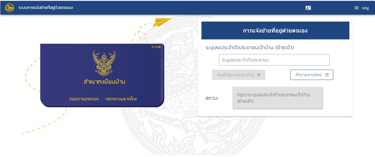 3.ระบบการแจ้งย้ายที่อยู่ด้วยตนเอง ซึ่งเป็นแจ้งความประสงค์ย้ายทะเบียนบ้านด้วยตนเองโดยไม่ต้องเดินทางไปที่ว่าการอำเภอหรือเขต