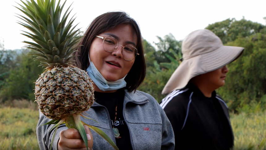 ซึ่งการปลูกค่อนข้างพิถีพิถัน ต้องใช้ผ้ายางคลุมพื้นดินร่องสับปะรด เพื่อเก็บความชื้น ป้องกันโรคและแมลง เป็นสวนสับปะรดที่เรียกได้ว่าแทบจะไม่ใช้สารเคมีเลย หลังปลูกสับปะรดแล้วจะใช้เวลาดูแลรักษานานประมาณ 12-14 เดือน จึงจะสามารถเก็บผลผลิตได้ โดยผลผลิตส่วนใหญ่แล้วจะส่งออกไปขายที่ประเทศจีน และขายทางออนไลน์ โดยบอกว่าช่วงฤดูหนาว สับปะรดในประเทศจีนจะมีรสเปรี้ยว จึงหันมาซื้อสับปะรดของตนเพราะมีรสชาติที่หวานอร่อย