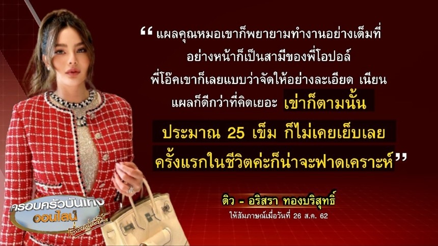 ซึ่งถ้าย้อนกลับไปเมื่อวันที่ 26 ส.ค.2562 ดิว อริสรา เคยให้สัมภาษณ์สื่อมวลชนถึงประเด็นเกิดอุบัติเหตุต้องเย็บที่หน้า 9 เข็ม, เข่า 25 เข็ม และนิ้ว 5 เข็ม