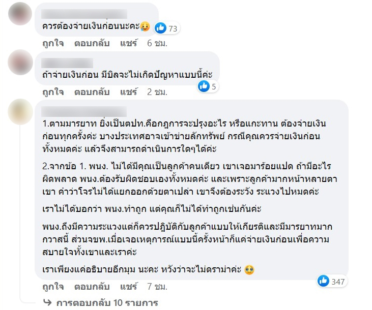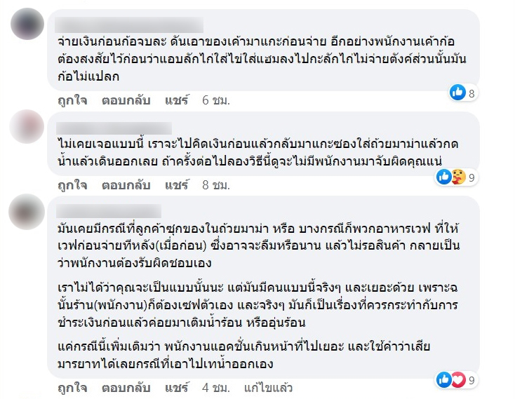 หลังเรื่องราวดังกล่าวถูกเผยแพร่ออกไป สมาชิกในกลุ่มดังกล่าวเข้ามาแสดงความคิดเห็นกันเป็นจำนวนมาก โดยมีการบอกว่า การกระทำของพนักงานดังกล่าวเป็นการเสียมารยาท แต่เนื่องจากอาจเกิดเหตุการณ์เคยถูกลูกค้าโกง ปรุงบะหมี่สำเร็จรูปก่อนโดยยังไม่ชำระเงิน ทำให้พนักงานต้องรับผิดชอบ ดังนั้นควรจ่ายเงินก่อนเพื่อไม่ให้เดเหตุการณ์ดังกล่าว