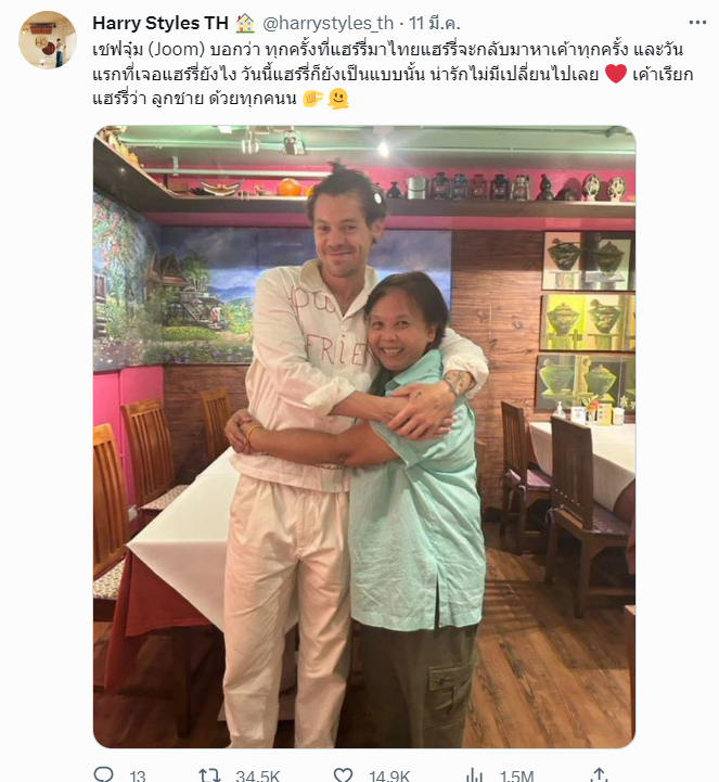 ล่าสุด ทวิตเตอร์ Harry Styles TH ก็ได้โพสต์ภาพของแฮร์รี ที่ถ่ายคู่กับเชฟจุ๋ม โดยว่า "เชฟจุ๋ม (Joom) บอกว่า ทุกครั้งที่แฮร์รี่มาไทยแฮร์รี่จะกลับมาหาเค้าทุกครั้ง และวันแรกที่เจอแฮร์รี่ยังไง วันนี้แฮร์รี่ก็ยังเป็นแบบนั้น น่ารักไม่มีเปลี่ยนไปเลย ❤️ เค้าเรียกแฮร์รี่ว่า ลูกชาย ด้วยทุกคนน"