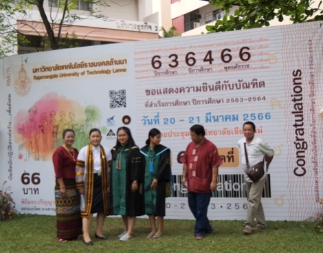มหาวิทยาลัยเทคโนโลยีราชมงคลล้านนา จ.เชียงใหม่ มีพิธีมอบปริญญาแก่ผู้สำเร็จการศึกษาประจำปีการศึกษาระหว่างวันที่ 20 – 21 มีนาคม 2566 ณ หอประชุมมหาวิทยาลัยเชียงใหม่ ปีนี้ทางมหาวิทยาลัยสร้างความสีสันกับป้ายแสดงความยินดีบัณฑิตที่จัดทำขึ้นและนำไปติดตั้งไว้ภายในสนามหญ้าให้เป็นพร็อพถ่ายรูป โดยเป็นลอตเตอรี ขนาดยักษ์ที่ระบุหมายเลข 636466 งวดที่ 63 ชุดที่ 64 ราคา 66 บาท พร้อมกับมีภาพกราฟฟิกของกลุ่มบัณฑิตเป็นพื้นหลังและยังมีลวดลาย บาร์โค้ด ถอดแบบมาจากลอตเตอรีแบบเป๊ะ ๆ ปรากฏว่าทั้งบัณฑิตและผู้ปกครองชื่นชอบในไอเดียสร้างสรรค์ พากันไปถ่ายภาพกับแบคดรอปนี้กันอย่างคึกคัก หลายคนบอกว่าจะเอาตัวเลขในลอตเตอรีจำลองใบนี้ไปลุ้นโชค