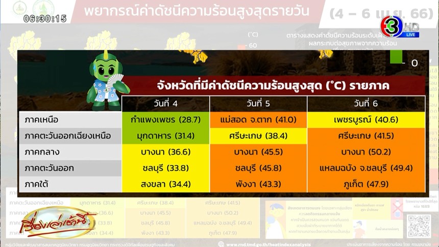 วานนี้ (4 เม.ย. 66) กรมอุตุนิยมวิทยา รายงานพยากรณ์ค่าดัชนีความร้อนสูงสุดรายวัน ตามภาคของประเทศไทย วันที่ 5-6 เมษายน 2566