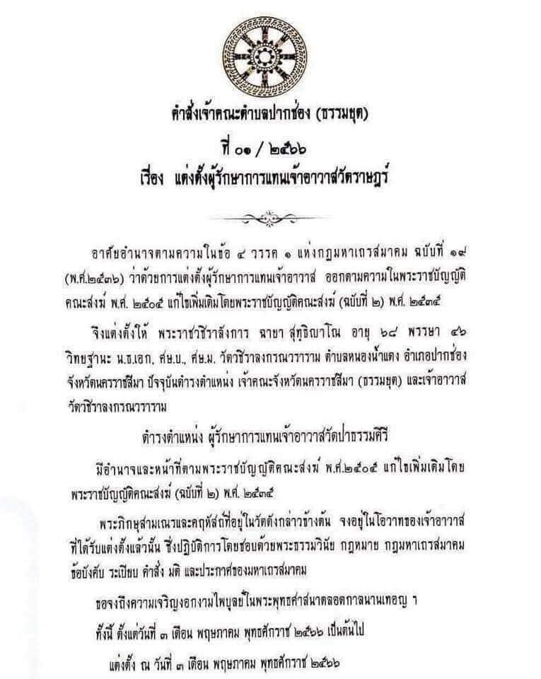 โดยคำสั่งดังกล่าว ระบุว่า คำสั่งเจ้าคณะตำบลปากช่อง (ธรรมยุต) เรื่อง แต่งตั้งผู้รักษาการแทนเจ้าอาวาสวัดราษฎร์ อาศัยอำนาจตามความในข้อ 4 วรรค 1 แห่งกฎมหาเถรสมาคม ฉบับที่ 19 (พ.ศ.2536) ว่าด้วยการแต่งตั้งผู้รักษาการแทนเจ้าอาวาส ออกตามความในพระราชบัญญัติคณะสงฆ์ พ.ศ.2505 แก้ไขเพิ่มเติมโดยพระราชบัญญัติคณะสงฆ์ (ฉบับที่ 2) พ.ศ.2535