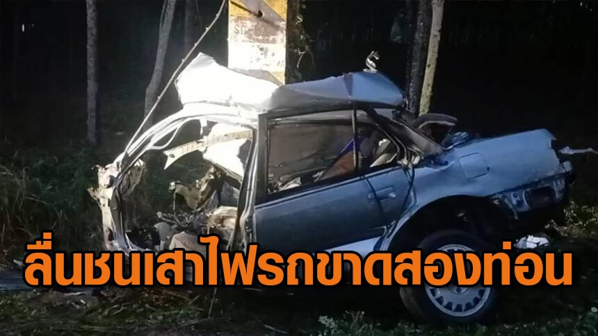 รถเก๋งขับฝ่าสายฝนลื่นเสียหลักหลุดโค้งพุ่งฟาดเสาไฟฟ้าขาด 2 ท่อน คนขับเสียชีวิตคาที่