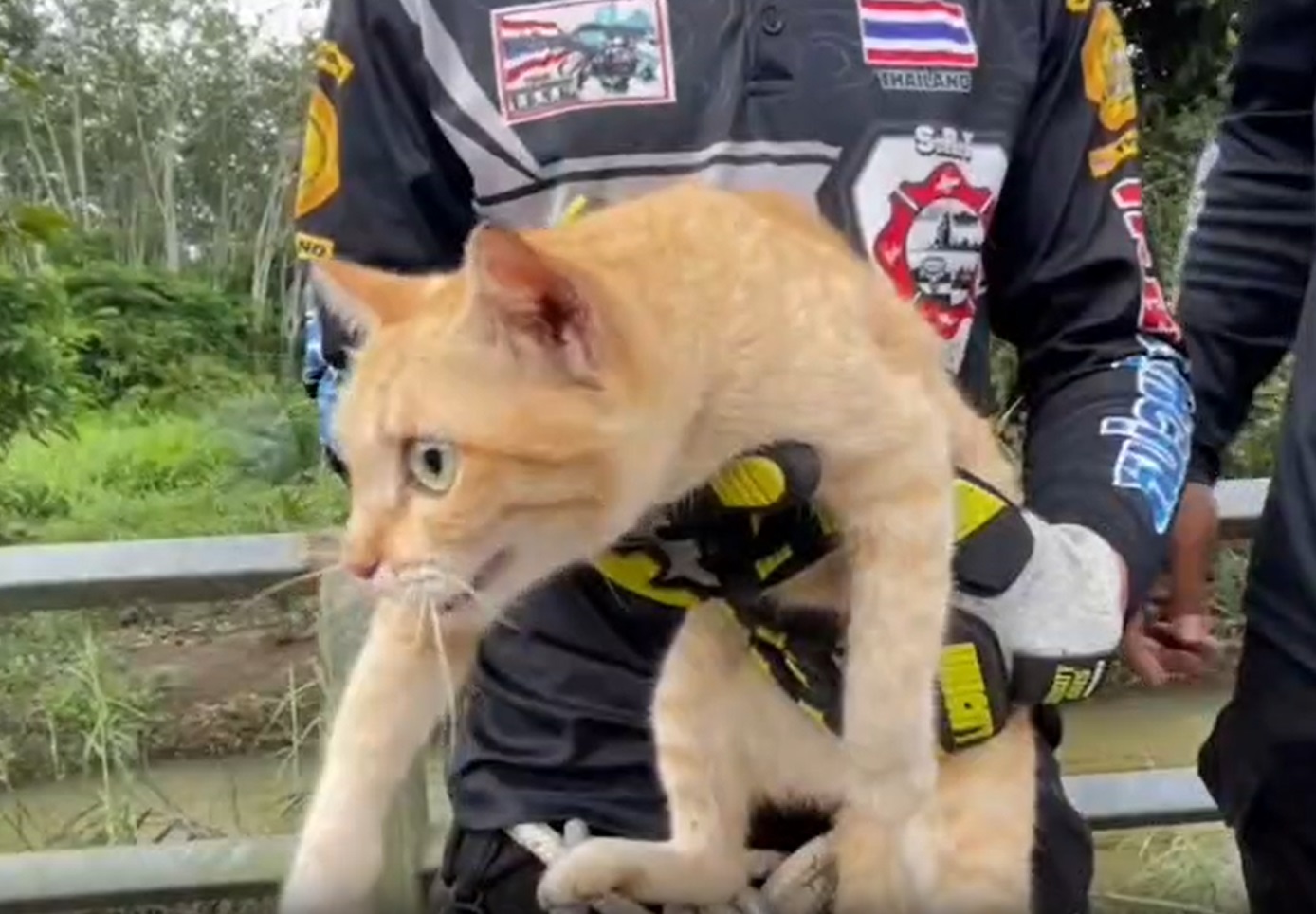 กู้ภัยไต่เชือก-โรยตัว ช่วยน้องแมวส้ม ติดอยู่บนยอดไม้สูง 6 เมตร นาน 2 วัน ได้สำเร็จ คาดตื่นตกใจวิ่งหนีหมาในวัด จนร้องเหมียวขอความช่วยเหลือจนหมดแรง
