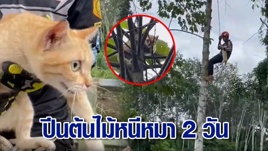 ‘แมวส้ม’ ตกใจหมา หนีเตลิดปีนต้นไม้ 6 เมตร ค้างนาน 2 วัน กู้ภัยไต่เชือกโรยตัวช่วยชีวิต