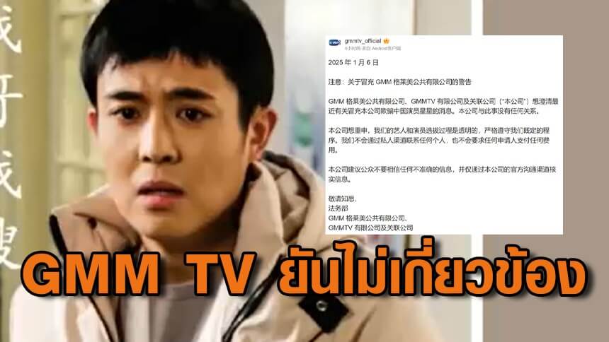 บริษัท จีเอ็มเอ็ม แกรมมี่ จำกัด (มหาชน) บริษัท จีเอ็มเอ็ม แกรมมี่ จำกัด (มหาชน) บริษัท จีเอ็มเอ็มทีวี จำกัด และบริษัทในเครือ (“บริษัท”) ขอชี้แจงรายงานล่าสุดที่มีผู้แอบอ้างเป็นบริษัทเพื่อฉ้อโกงนักแสดงชาวจีน และข่าวดารา บริษัทของเราไม่มีส่วนเกี่ยวข้องกับเรื่องนี้