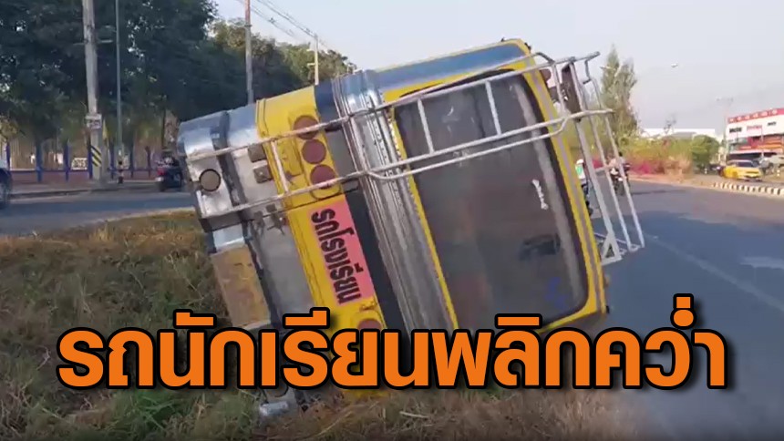 รถรับส่งนักเรียน เสียหลักพลิกคว่ำตกร่องกลางถนน บาดเจ็บกว่า 10 คน