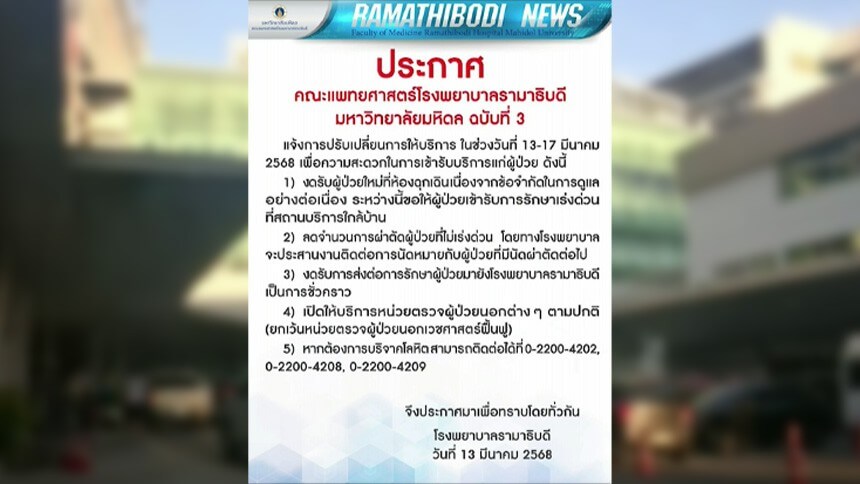 รพ.รามาฯ แจ้งปรับให้บริการ หลังไฟไหม้ งดรับผู้ป่วยใหม่ห้องฉุกเฉิน-ลดเคสผ่าตัด 13-17 มี.ค. นี้