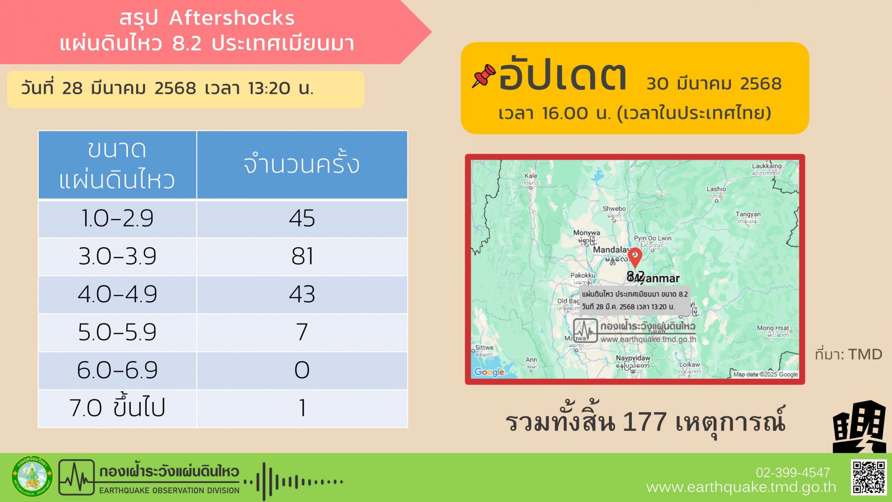 ล่าสุด กรมอุตุนิยมวิทยา เปิดเผยว่า สรุป Aftershock (อาฟเตอร์ช็อก) 30 มีนาคม 2568 เวลา 16.00 น. จำนวน 177 ครั้ง โดยมีแผ่นดินไหวขนาด 1.0-2.9 จำนวน 45 ครั้ง ขนาด 3.0-3.9 จำนวน 81 ครั้ง ขนาด 4.0-4.9 จำนวน 43 ครั้ง ขนาด 5.0-5.9 จำนวน 7 ครั้ง และ ขนาด 7.0 ขึ้นไป จำนวน 1 ครั้ง