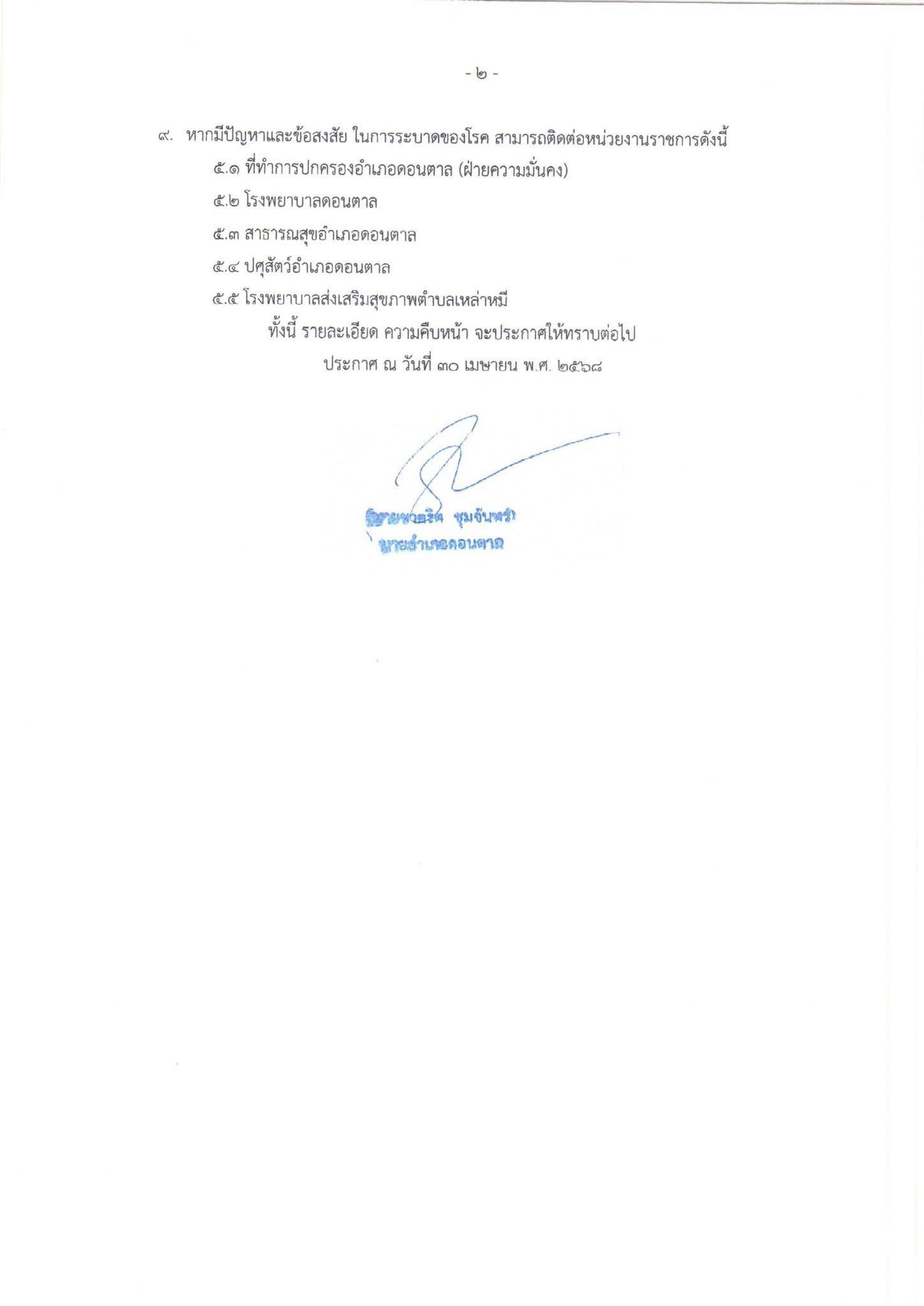 วันที่ 30 เม.ย.68 ผู้สื่อข่าวได้รับรายงาน ประกาศอำเภอดอนตาล เรื่อง มาตรการควบคุมโรค (ฉบับที่ 1) ด้วยปรากฏว่า ได้มีเหตุการณ์ผู้เสียชีวิต 1 ราย ในตำบลเหล่าหมี อำเภอดอนตาล จังหวัดมุกดาหาร เสียชีวิตลง เมื่อวันที่ 30 เมษายน พ.ศ. 2568 โดยได้มีการสัมผัสโค กระบือ และรับประทานเนื้อวัว และได้อาการเป็นไข้ และมีตุ่มบริเวณผิวหนัง จึงได้ไปเข้ารับการรักษาที่โรงพยาบาลดอนตาล เมื่อวันที่ 27 เมษายน พ.ศ. 2568 และทางโรงพยาบาลดอนตาล ได้มีการส่งตัวเข้ารับการรักษาที่โรงพยาบาลมุกดาหาร และเสียชีวิตในเวลาต่อมา โดยสันนิษฐานเบื้องต้นว่า มีการติดเชื้อโรคแอนแทรกซ์