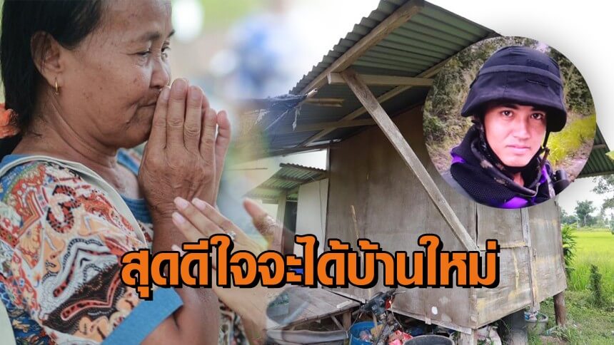 แม่ของนายทหารพรานแนวหน้า หรือนักรบชุดดำดีใจ หลังกรมทหารช่าง จ.ราชบุรี เข้ามาช่วยสร้างบ้านหลังใหม่ ที่ได้รับบาดเจ็บจากเหตุประทะกันที่ชายแดนไทย – กัมพูชา หลังรู้ข่าวว่าลูกชายอยู่กระท่อมเล็กๆ ผุพัง ไม่มีน้ำไฟฟ้าใช้