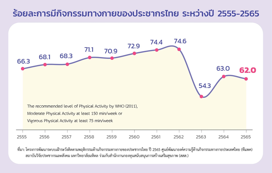 • ในปัจจุบันจากตัวเลขสถิติปี 2565 ร้อยละของการมีกิจกรรมทางกายของประชากรไทย แสดงให้เห็นว่ากว่า ร้อยละ 38 ยังมีกิจกรรมทางกายที่ไม่เพียงพอ มีเพียงร้อยละ 62 ที่มีกิจกรรมทางกายเพียงพอ จึงเป็นที่มาที่ สสส. และภาคีเครือข่ายอยากสนับสนุนให้คนไทยมีกิจกรรมทางกายเพิ่มสูงขึ้นๆ โดย สสส. เชื่อว่า การวิ่งเป็นหนึ่งในวิธีที่ง่าย ค่าใช้จ่ายไม่สูง และสามารถทำได้ทุกที่