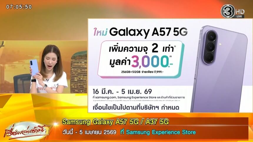 โปรโมชั่นพิเศษช่วงเปิดตัว ซื้อ Samsung Galaxy A57 5G ในราคา 17,999 บาท รับฟรี อัพความจุเพิ่ม 2 เท่า จาก 256 GB เป็น 512 GB (มูลค่า 3,000 บาท) ทันที