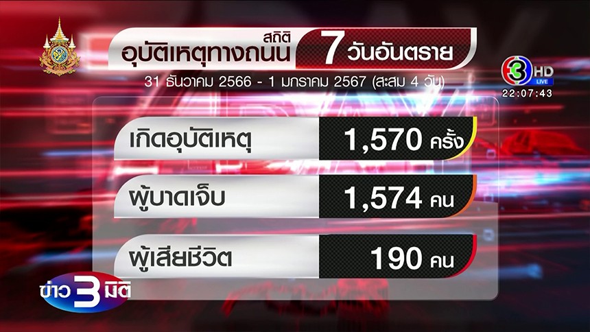 โดยสถิติภาพรวมอุบัติเหตุ ทั้งบาดเจ็บและเสียชีวิตในปีนี้ ถือว่าลดลงจากค่าเฉลี่ย 3 ปีย้อนหลัง ข่าว 3 มิติ ค้นข้อมูลศปถ.ปีที่เเล้ว พบว่าในช่วงเวลาเดียวกันมีอุบัติเหตุรวมถึง 2,440 ครั้ง บาดเจ็บ 2,437 ราย เสียชีวิตมากถึง 317 ราย ซึ่งปีนี้จำนวนผู้เสียชีวิตลดลงมาอยู่ที่ 190 ราย