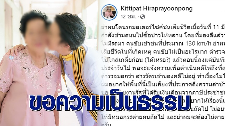 หลานชายโวย ย่าถูกรถ จยย.ชนเสียชีวิต ขณะข้ามถนน ตร.ให้ไกล่เกลี่ย-ลงบันทึกประจำวัน