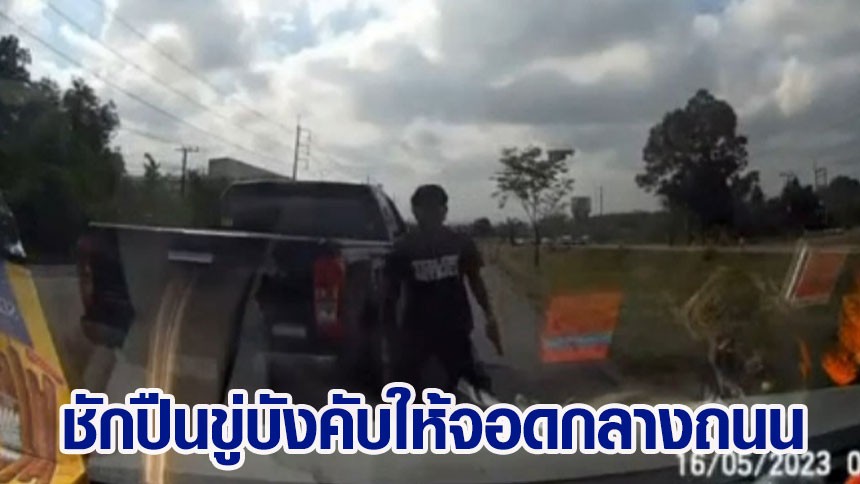 กระบะหัวร้อน ชักปืนขู่บังคับให้จอดกลางถนน หลังรถอีกคันไม่ให้แซง