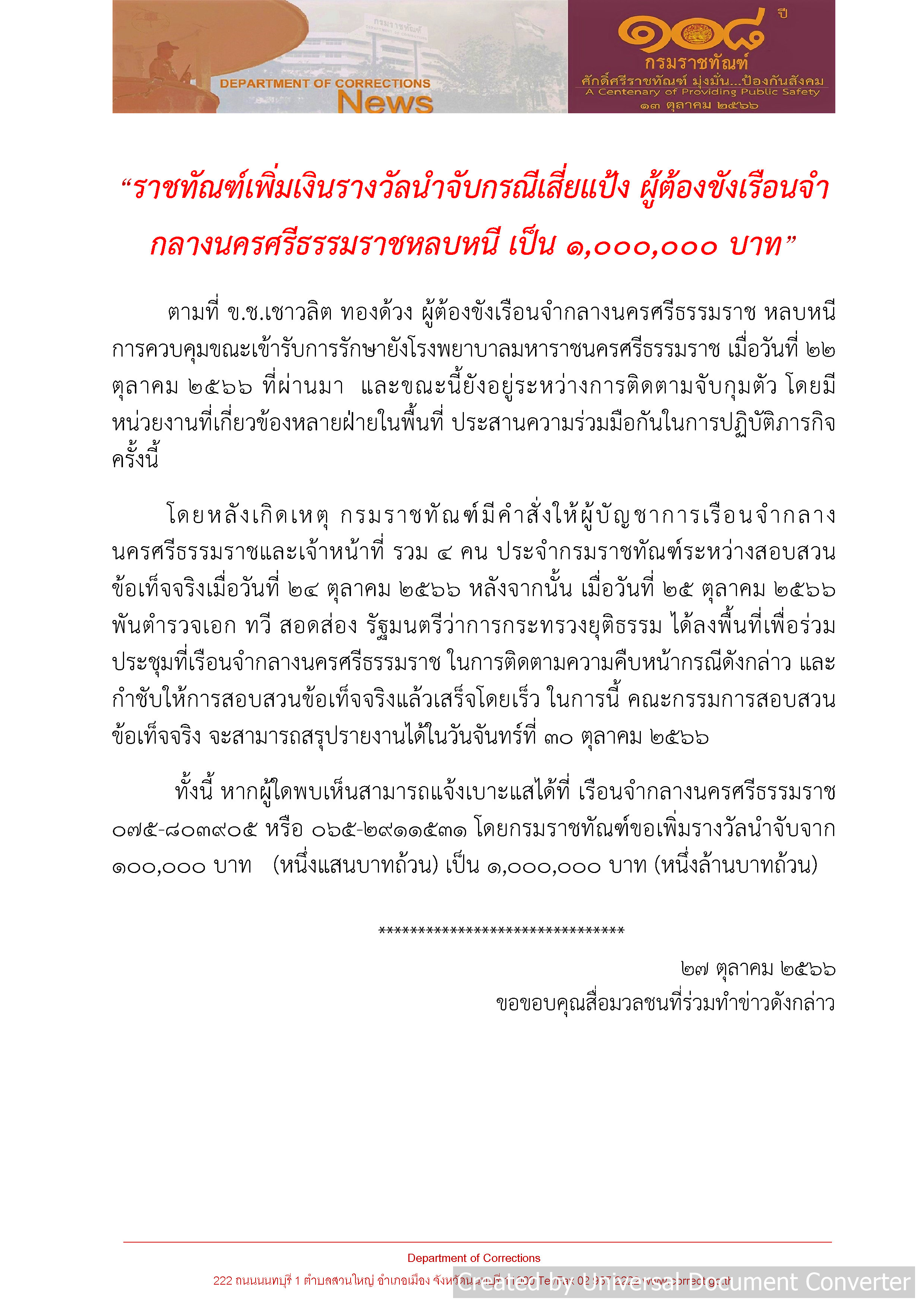 ทั้งนี้ หากผู้ใดพบเห็นสามารถแจ้งเบาะแสได้ที่ เรือนจำกลางนครศรีธรรมราช 075-803905 หรือ 065-291-1531 โดยกรมราชทัณฑ์ขอเพิ่มรางวัลนำจับจาก 100,000 บาท (หนึ่งแสนบาทถ้วน) เป็น 1,000,000 บาท (หนึ่งล้านบาทถ้วน)