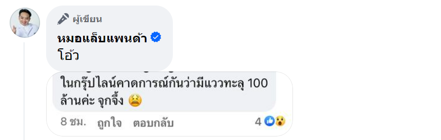 ต่อมาในคอมเมนต์พบข้อมูลว่า มีการคุยกันในกลุ่มผู้เสียหาย ซึ่งคาดการณ์ว่าเสียหายเป็นเงินมากกว่า 100 ล้านบาท