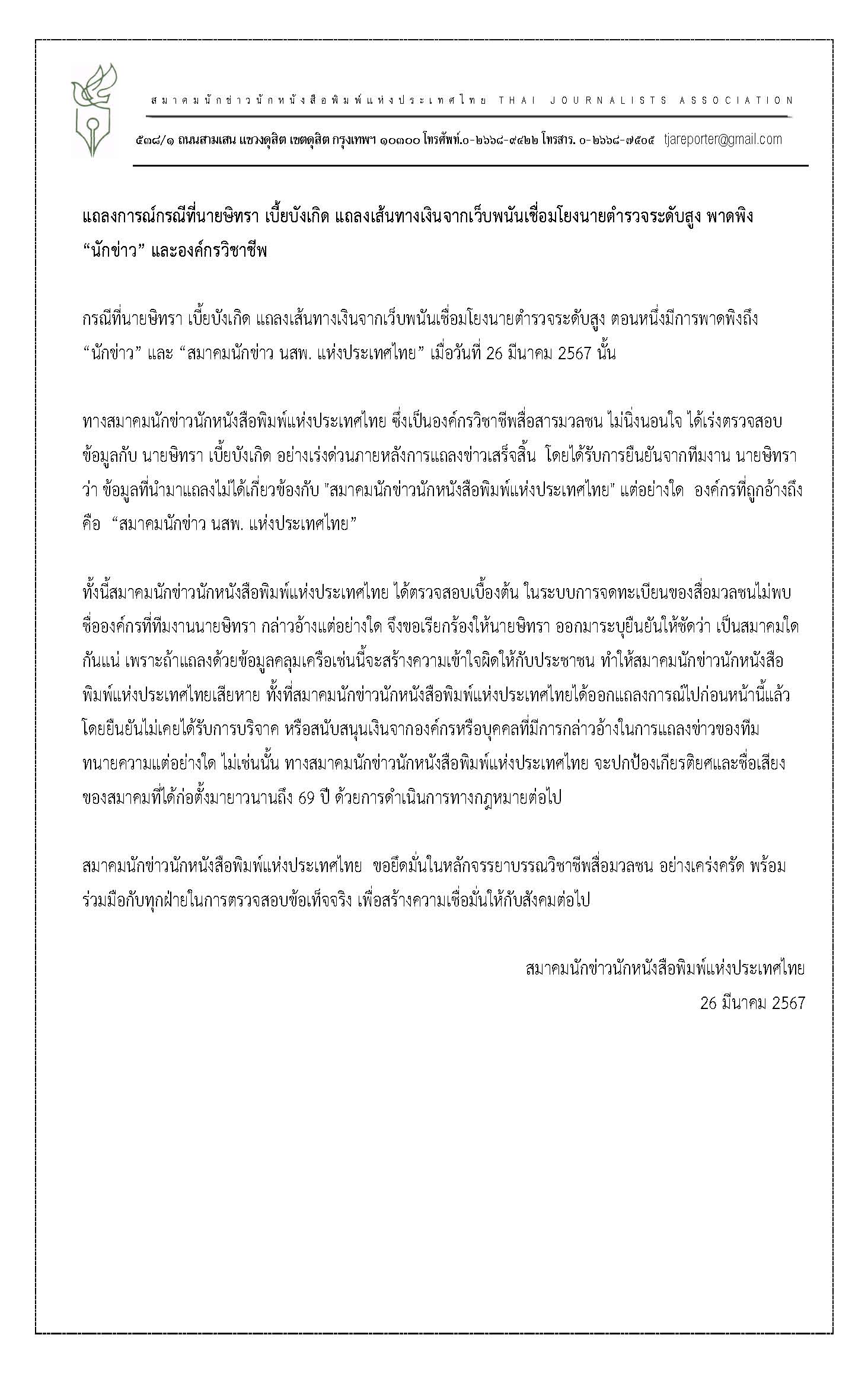 ทั้งนี้เนื่องจาก สมาคมนักข่าวนักหนังสือพิมพ์แห่งประเทศไทย เผยแพร่เอกสาร ระบุว่า แถลงการณ์กรณีที่นายษิทรา เบี้ยบังเกิด แถลงเส้นทางเงินจากเว็บพนันเชื่อมโยงนายตำรวจระดับสูง พาดพิง “นักข่าว” และองค์กรวิชาชีพ