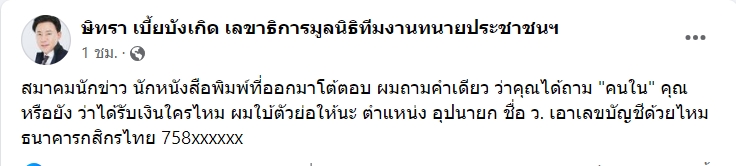 ผู้สื่อข่าวรายงานว่า นายษิทรา เบี้ยบังเกิด หรือ ทนายตั้ม เลขาธิการมูลนิธิทีมงานทนายประชาชน ได้โพสต์ข้อความผ่านเพจเฟซบุ๊ก โดยระบุว่า สมาคมนักข่าว นักหนังสือพิมพ์ที่ออกมาโต้ตอบ ผมถามคำเดียว ว่าคุณได้ถาม "คนใน" คุณหรือยัง ว่าได้รับเงินใครไหม ผมใบ้ตัวย่อให้นะ ตำแหน่ง อุปนายก ชื่อ ว. เอาเลขบัญชีด้วยไหม ธนาคารกสิกรไทย 758xxxxxx