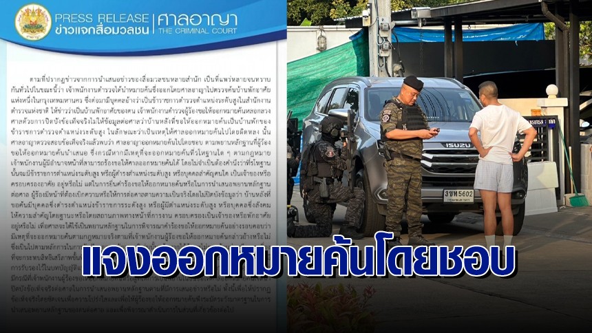 ศาลอาญาออกแถลงการณ์ ชี้แจงกรณีถูกพาดพิงว่า โดนตำรวจหลอกในการขอออกหมายค้นบ้าน "บิ๊กโจ๊ก" เตรียมตรวจสอบพนักงานสอบสวนที่มาขอหมาย ได้แจ้งข้อเท็จจริงครบไหม