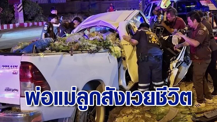 ตำรวจ สภ.สามพราน เข้าตรวจสอบที่เกิดเหตุ พบรถกระบะโตโยต้าสีขาว แบบแคป พังยับเยินทั้งคัน อยู่ในหลุมถนน ที่ถูกขุดไว้เตรียมซ่อมแซม ผักที่ขนมาด้วยกระจายเกลื่อน ในซากรถพบร่าง 3 พ่อแม่ลูก คือ นายนพรัตน์ อายุ 49 ปี คนขับ / นางสาวสุจิรัตตา อายุ 47 ปี และนายเอกสิทธิ์ อายุ 18 ปี ทั้งหมดเสียชีวิต กู้ภัยเครื่องตัดถ่างมาช่วยนำร่างออกจากซากรถ โดยต้องใช้เวลาถึง 2 ชั่วโมง ตัดถ่างนำศพออกมาได้ จึงนำร่างออกมาได้ทั้งหมด