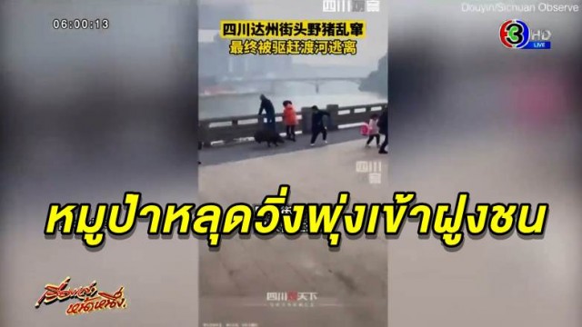 มาไง! หมูป่าหลุด วิ่งไล่ขวิดคนที่เสฉวน ก่อนจะโดดลงน้ำหนีกลับเข้าป่า