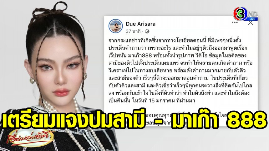 'ดิว อริสรา' โพสต์สวนเพจดัง หลังสงสัยอาชีพสามี - มีรถ ตร.นำขบวน เตรียมเปิดใจปม 'มาเก๊า 888' เร็วๆนี้