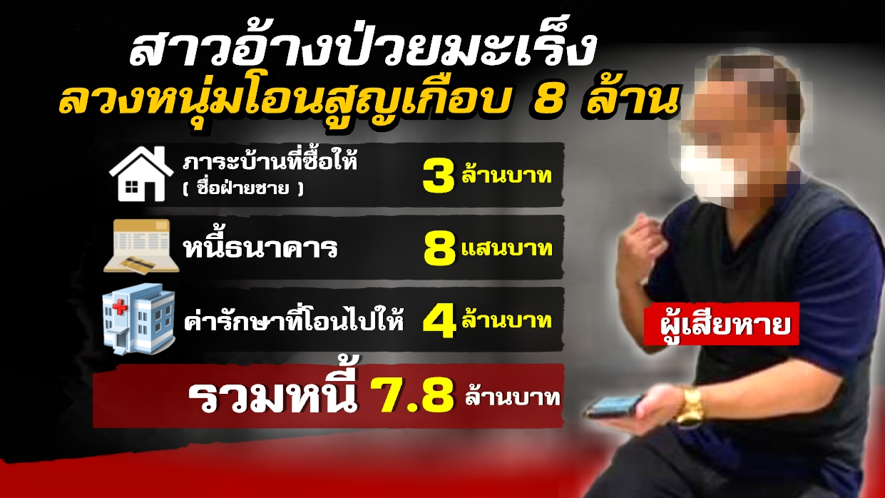 ภายหลังฝ่ายหญิงบอกว่า ตัวเองเป็นมะเร็งปากมดลูก ระยะที่ 3 ต้องผ่าตัดทำ CT Scan ฝ่ายชายจึงทุ่มเงินค่ารักษาให้หมดไปกว่า 4 ล้านบาท ก่อนมาจับได้ว่าใบรับรองแพทย์และใบเสร็จถูกปลอมขึ้น