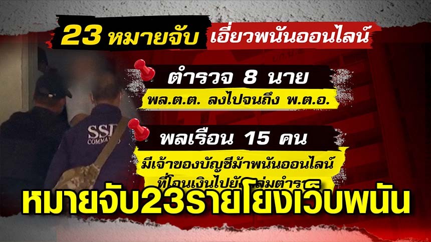 ออกหมายจับ 23 ราย ปมโยงเว็บพนันออนไลน์ ล่าสุด จับตร.ได้แล้ว 14 นาย