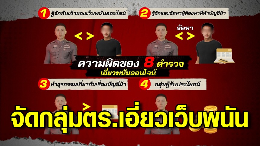 โดยตำรวจได้มีการสืบสวนจากหลักฐานที่บ่งชี้ชัดเจนว่า 8 นายตำรวจบางนายมีพฤติการณ์ลักษณะเป็นผู้บริหารเว็บไซต์พนันออนไลน์หรือเสมือนเป็นเจ้าของ ส่วนบางนายก็มีผลประโยชน์เชื่อมโยงในแต่ละกลุ่ม บางคนก็มีหลายพฤติการณ์ โดยพบว่าได้กระทำผิดมานานกว่า 2 เดือนแล้ว แต่จะมีจำนวนเงินหมุนเวียนเชื่อมโยงกับตำรวจเท่าใดนั้นยังไม่สามารถเปิดเผยได้ แต่ยืนยันว่ามีตำรวจยศพลตำรวจตรีถึงพันตำรวจเอกเข้าไปมีส่วนเกี่ยวข้อง