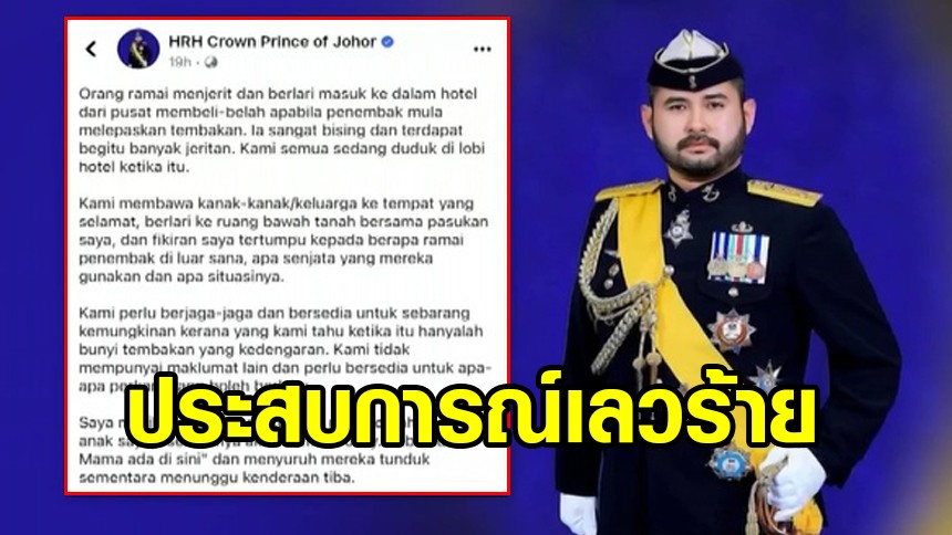'เจ้าชายยะโฮร์' ติดในโรงแรมใกล้พารากอน ขณะเหตุกราดยิง ชี้เป็นประสบการณ์ที่เลวร้ายที่สุดในชีวิต