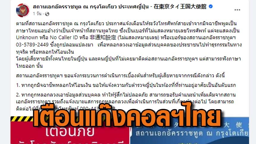 สถานทูตฯเตือนแก๊งคอลเซ็นเตอร์ไทยโทรมาไกลถึงญี่ปุ่น