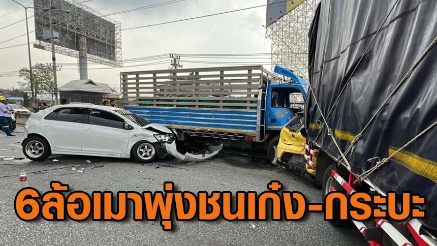 โชเฟอร์เมาขับ 6 ล้อพุ่งชนเก๋ง-กระบะ-รถบรรทุกรวม 7 คันพังยับ เจ็บ 4 ราย