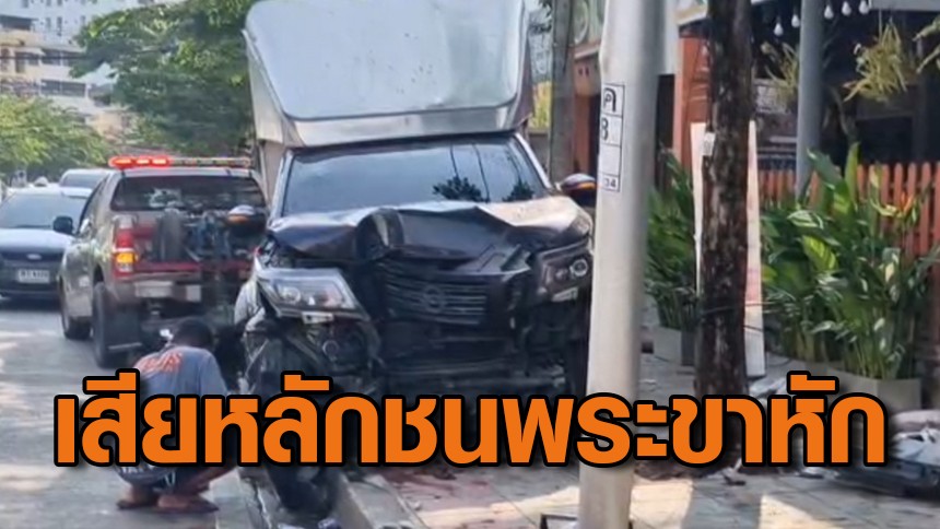 กระบะลื่นถนน พุ่งชนพระขาหัก ก่อนเสียหลักชนจักรยานยนต์-เสาไฟ พังยับ