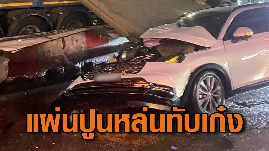 ระทึก! แผ่นปูนขนาดใหญ่จากรถบรรทุก หล่นทับรถเก๋งพังยับ คนขับเจ็บเล็กน้อย