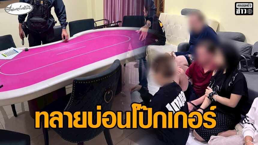 บุกทลายบ่อนโป๊กเกอร์กลางเมืองชล ชาวต่างชาติวิ่งหนีกระเจิง รวบนักพนักนับสิบราย หลังสืบจากมือถือหนุ่มจีน สารภาพเป็นบ่อนลอย ย้ายที่ไปเรื่อยๆ นัดกันผ่านโซเชียล