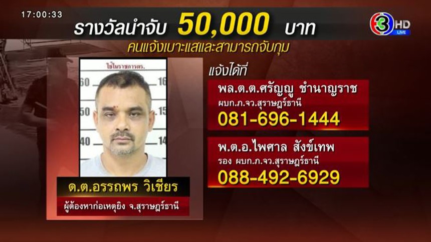 ผู้การจังหวัดสุราษฎร์ธานี ตั้งรางวัลนำจับดาบตำรวจอรรถพร 50,000 บาท หลังพาพวกใช้อาวุธสงครามยิงถล่มบ้านพ่อตา สุดท้ายมีผู้เสียชีวิตรวม 6 ศพ ล่าสุดญาติดาบตำรวจอรรถพร แจงปมสังหาร เพราะถูกพ่อตาโกงที่ดินสวนปาล์ม