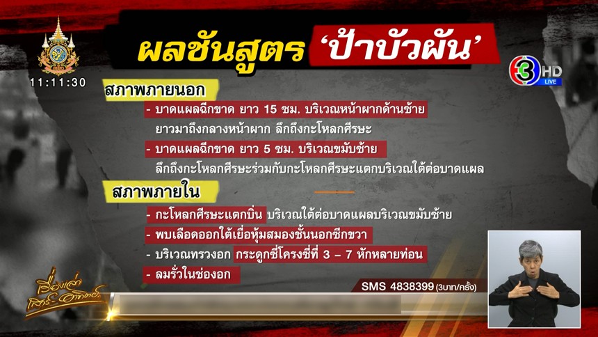สภาพศพภาพนอก : ปรากฏบาดแผลฉีกขาดความยาวประมาณ 15 เซนติเมตร บริเวณหน้าผากด้านซ้ายยาวมาจนถึงกลางหน้าผากลึกถึงกะโหลกศรีษะ และพบบาดแผลฉีกขาดขนาดประมาณ 5 เซนติเมตรบริเวณขมับซ้ายลึกถึงกะโหลกศรีษะ ร่วมกับกะโหลกศีรษะแตกบิ่นบริเวณใต้ต่อบาดแผล