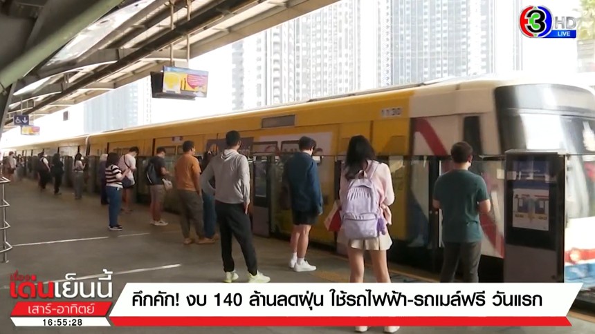 มาตรการลดฝุ่น PM 2.5 ให้บริการรถไฟฟ้าฟรีวันแรก ในเขต กทม.และปริมณฑล ของรัฐบาล พบว่ามีผู้ใช้บริการรถไฟฟ้า รวม 1.63 ล้านคน-เที่ยว เพิ่มขึ้นร้อยละ 45.29 เมื่อเทียบกับค่าเฉลี่ยวันเสาร์ในเดือนนี้