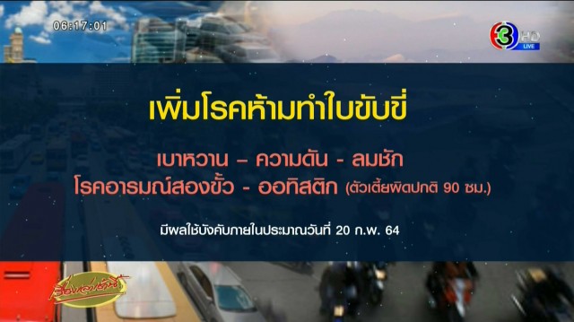 จ่อเพิ่มโรค 'เบาหวาน-ความดัน-ลมชัก' ห้ามทำใบขับขี่ ต้องให้แพทย์ประเมิน ออกใบรับรองแพทย์