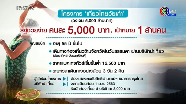 กระทรวงการท่องเที่ยวและกีฬาจัดโครงการเที่ยวไทยวัยเก๋า กระตุ้นผู้สูงอายุออกไปเที่ยวในรูปแบบมีผู้ดูแลตลอดเวลา วงเงินงบประมาณ 5 พันล้าน โดยมีเงื่อนไขดังนี้