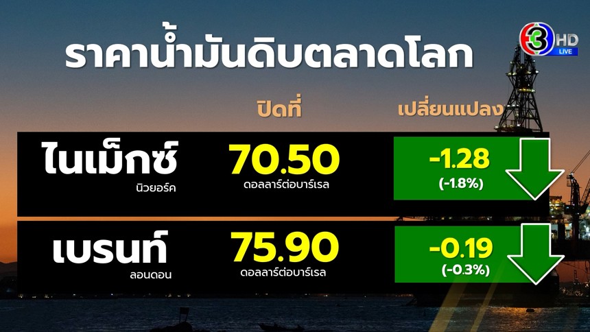 - ตลาดไนเม็กซ์ นิวยอร์ก ลดลง 1.28 ดอลลาร์สหรัฐฯ/บาร์เรล ปิดที่ 70.50 ดอลลาร์สหรัฐฯ/บาร์เรล
