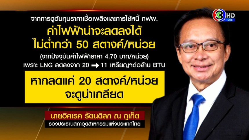 ด้านนายอิศเรศ รัตนดิลก ณ ภูเก็ต รองประธานสภาอุตสาหกรรมแห่งประเทศไทย (ส.อ.ท.) กล่าวว่า จากการดูต้นทุนราคาเชื้อเพลิงและการใช้หนี้ กฟผ.แล้ว ค่าไฟฟ้าน่าจะลดลงได้ไม่ต่ำกว่า 50 สต.ต่อหน่วย จากปัจจุบันเฉลี่ย 4.70 บาทต่อหน่วย เพราะราคาแอลเอ็นจีลดลงจากกว่า 20 เหรียญฯต่อล้านบีทียู เหลือ 11 เหรียญฯต่อล้านบียู