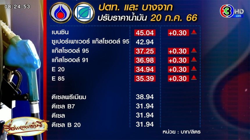 ส่งผลให้เบนซินอยู่ที่ 45.04 บาท/ลิตร แก๊สโซฮอล์ 95 อยู่ที่ 37.25 บาท/ลิตร / แก๊สโซฮอล์ 91 อยู่ที่ 36.98 บาท/ลิตร / E20 อยู่ที่ 34.94 บาท/ลิตร / E85 อยู่ที่ 35.39 บาท/ลิตร ส่วนซูเปอร์พาวเวอร์ แก๊สโซฮอล์ 95 คงเดิมอยู่ที่ 42.94 บาท/ลิตร มีผล วันที่ 20 ก.ค.2566 เวลา 05.00 น. เป็นต้นไป โดยราคาที่ประกาศเป็นราคาขายปลีกในกรุงเทพมหานคร ที่ยังไม่รวมภาษีบำรุงท้องถิ่น