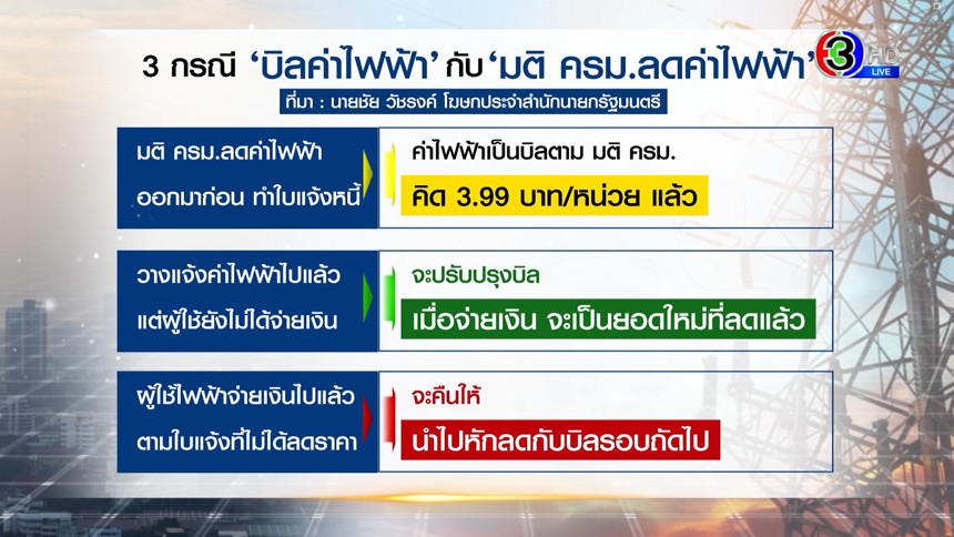 ส่วนกรณีสุดท้าย ถ้าผู้ใช้ไฟฟ้าจ่ายเงินไปแล้ว ตามใบแจ้งหนี้ที่ยังไม่ได้ลดราคา ขอให้ผู้ใช้ไฟฟ้าไม่ต้องกังวล จะไปคืนให้โดยนำไปลดกับบิลค่าไฟเดือนถัดไป