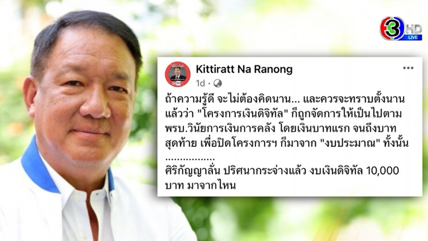 'กิตติรัตน์' ชี้ถ้าความรู้ดี จะรู้ว่าเงินดิจิทัลทำตามวินัยการเงิน โต้ 'ศิริกัญญา' โพสต์โจมตี