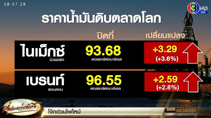 - ตลาดไนเม็กซ์ นิวยอร์ก เพิ่มขึ้น 3.29 ดอลลาร์สหรัฐฯ/บาร์เรล ปิดที่ 93.68 ดอลลาร์สหรัฐฯ/บาร์เรล